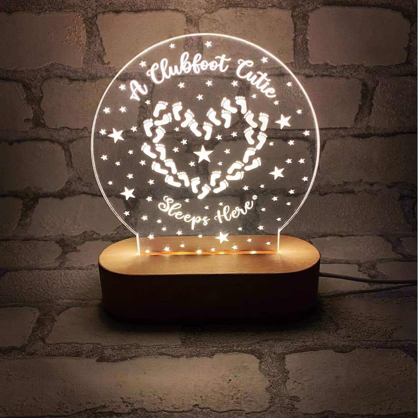 A beautiful Night light in acrylic on wooden base. Beautifully etched with my signature feet in heart and stars, with A Clubfoot cutie sleeps here.