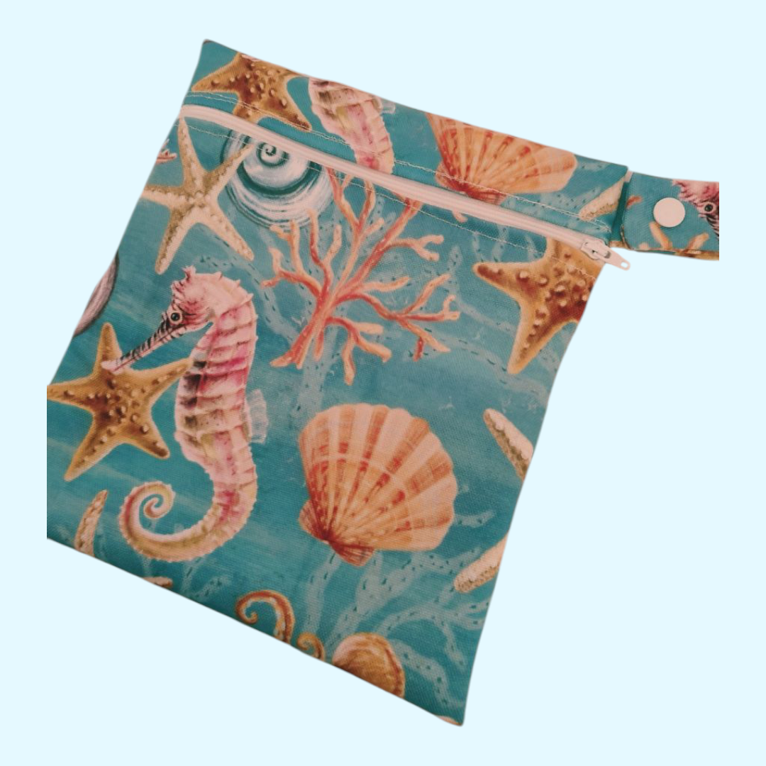Waterproof zip bags, in soft PUL fabric, perfect for swim gear, nappies or wipes when out and about. Useful loop handle to attach to buggies or rucksacks.